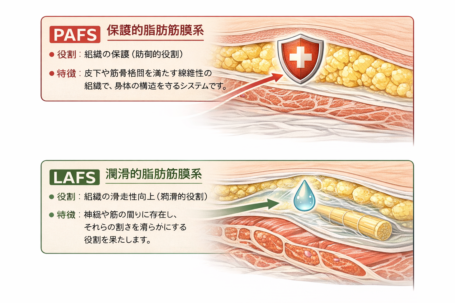 身体の皮下組織には、大きく2つの脂肪筋膜システムがあります。