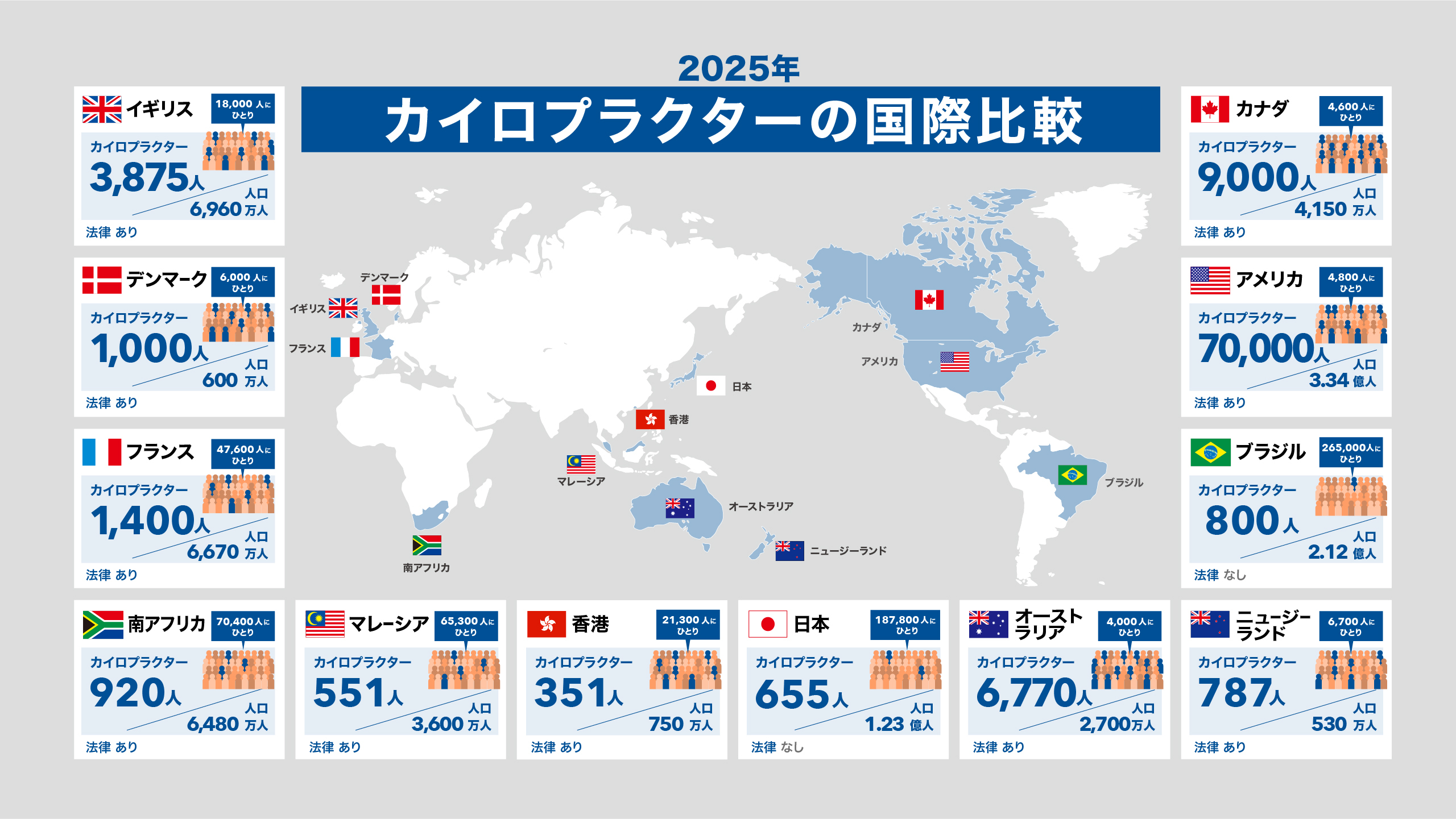 カイロプラクティックは世界40カ国以上で法制化され、80カ国以上で実践されている医療として認識されており、立ち位置は準医師(日本でいう歯科医師や獣医師)に相当します。